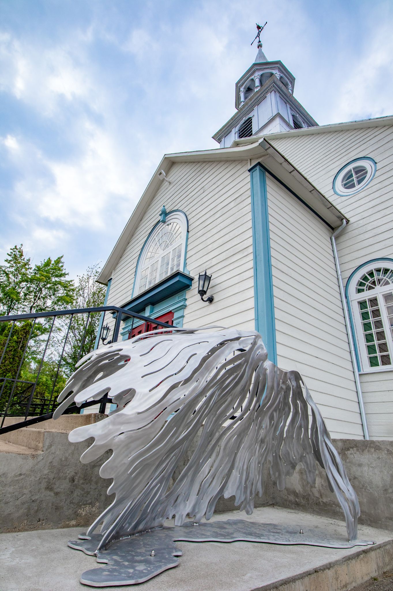 Inspirée par les courants du fleuve et des vents, l’œuvre Le souffle des courants se déploie dans un mouvement délicat et vibrant. La forme fluide et aérienne incarne l’harmonie du paysage côtier du fleuve et reflète les vocations de l’église de Saint-Irénée. La composition de l’œuvre est réalisée à partir d’un point de fuite, ce qui permet plusieurs interprétations.